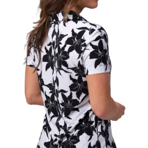 Elevate your look with our fitted Aurora Polo in a stylish black and white floral print. Crafted from 100% double knit jacquard, it offers high moisture transportation, breathability, and shape retention for lasting comfort. The design is enhanced with “Live Lucky” on the right sleeve, perfect for those who embrace style and positivity.